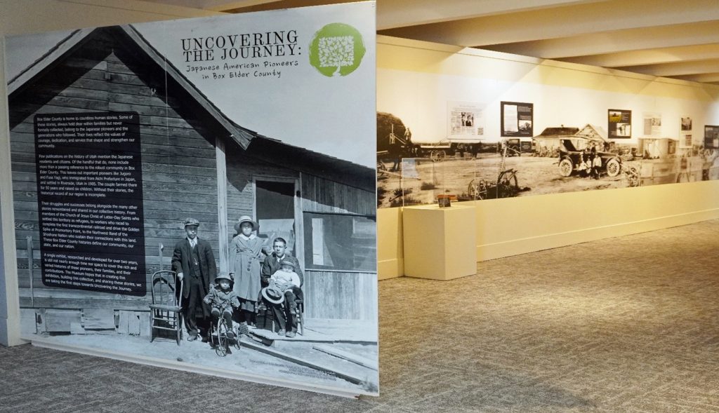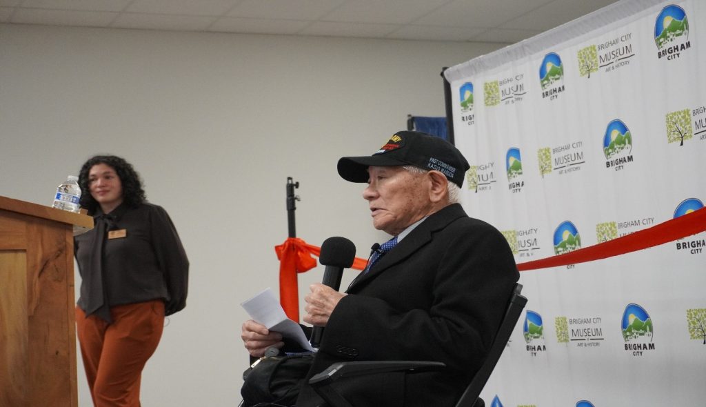 Norio Uyematsu, 94, addressed the over 270 people in attendance at the Ribbon Cutting Grand Opening of the Japanese pioneer exhibit with Museum Director Alana Blumenthal listening to his comments as honored guest and the Brigham City Museum exhibit is opening to rave reviews from the local community. This 2,000 square foot exhibit is the most successful in the museum’s history and will run through June 21, 2025. (https://brighamcitymuseum.org/)