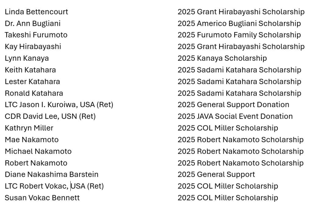 - Ten JAVA Memorial Scholarships ($1,500), honoring Nisei veterans, JAVA member and/or their family members.