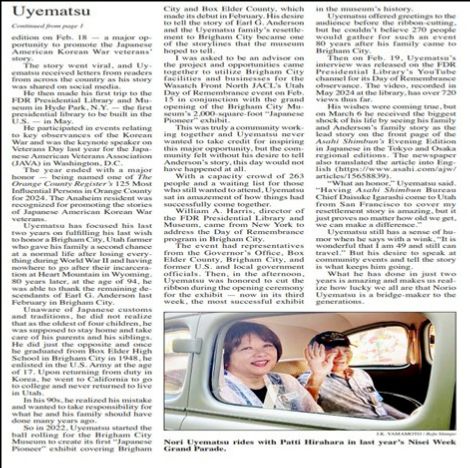 | Washington D.C. Norio Uyematsu was interviewed by FDR Presidential Library and Museum Director William A. Harris at the FDR Presidential Library in May of last year in preparation for their Day of Remembrance observance on February 19, 2025 for the 83rd commemoration of the signing of Executive Order 9066 by President Franklin Delano Roosevelt on February 19, 1942 which forcibly incarcerated 120,000 persons of Japanese ancestry in Japanese American concentration camps during WWII. Two-thirds of those incarcerated were American citizens. Uyematsu shared his family’s resettlement story after they had nowhere to go after losing everything in Campbell, California and resettled in Brigham City, Utah in November of 1945. His family and their descendants have lived in Brigham City, Utah for 80 years and it was where, at the age of 17, Uyematsu enlisted in the U.S. Army and was sent to Korea and served with the 521st Military Intelligence Service as an interrogator of Prisoners of War. FDR Presidential Library Director William A. Harris pre-taped the interview since he was the keynote speaker for the 2025 Utah Day of Remembrance on Saturday February 15, 2025 in Brigham City, Utah sponsored by the Wasatch Front North JACL in partnership with the Mt. Olympus and Salt Lake JACL Chapters and the Brigham City Museum of Art and History. Uyematsu inspired the Utah DOR event in addition to the Grand Opening of the Brigham City Museum’s Japanese pioneer exhibit. This exhibition development started in November of 2022. By Patti Hirahara |