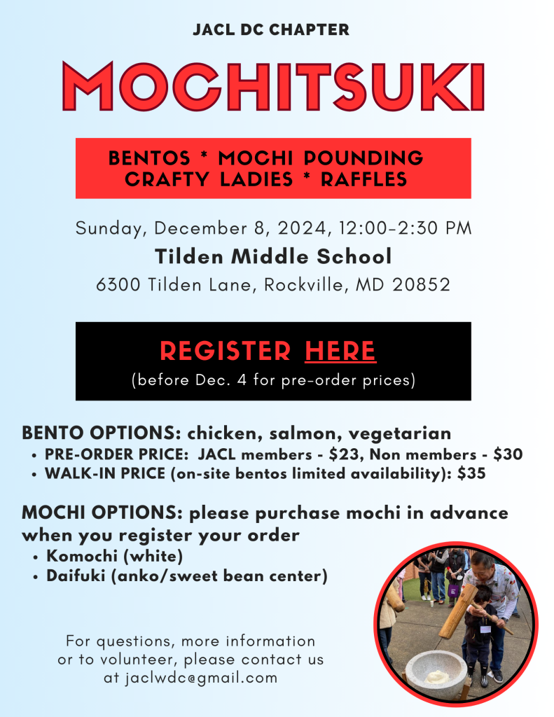 | The JACL DC Chapter is hosting their annual New Year’s tradition, Mochitsuki, on Sunday, December 8 at Tilden Middle School, 6300 Tilden Ln, Rockville, MD 20852 from 12:00-2:30 PM. Come join us for a fun-filled, Japanese American community event where people of all ages can take part in pounding rice, purchasing handmade holiday crafts and the recently published graphic novel, But, Where Are You REALLY From? Kick off the holiday season by seeing old friends and making new ones! Funds raised from this event help to sustain JACL DC Chapter activities throughout the year. Thank you for your support and generosity. We look forward to welcoming you to this annual family tradition. Bentos: Chicken Teriyaki, Salmon Teriyaki, and Vegetarian; comes with a dessert, sides, and hot and cold non-alcoholic drinks. Please note there will be a limited number of extra bentos available to walk-ins and they sell out quickly. Please pre-order by December 4 to reserve your bentos and mochi. Pre-order Prices: JACL Members: $23; Non-Members: $30; Walk-in Price: $35 Mochi: Komochi (plain white mochi) and Daifuku (soft mochigashi with anko/sweet bean inside) Pre-order PricesKomochi: JACL Members: $7 per 1/2 pound bag; Non-Members: $10 per 1/2 pound bag Daifuku: JACL Members: $10 per 1/2 pound bag; Non-Members: $12 per 1/2 pound bag Walk-in Prices for both Members and Non-Members: Komochi ~ $15 per 1/2 pound bag; Daifuku ~ $15 per 1/2 pound bag Crafty Ladies The talented Crafty Ladies group will once again be selling their unique handcrafted gifts. Be ready to do some holiday shopping! Friendly Reminder: Purchases are either by cash or check! Raffle It is not a Mochitsuki without the famous Raffle! Support the DC Chapter while winning the chance to take home fabulous items. Donation to the Chapter If you would like to donate to the DC Chapter, please click on “Tickets” and scroll down to support to their small but mighty community organization! Your generous donation will allow us to continue organizing community events throughout the year. We welcome volunteers! We need help with set up, clean up, servers, greeters, etc…If you can lend a hand on the day or have questions, please send an email to: [email protected] |
