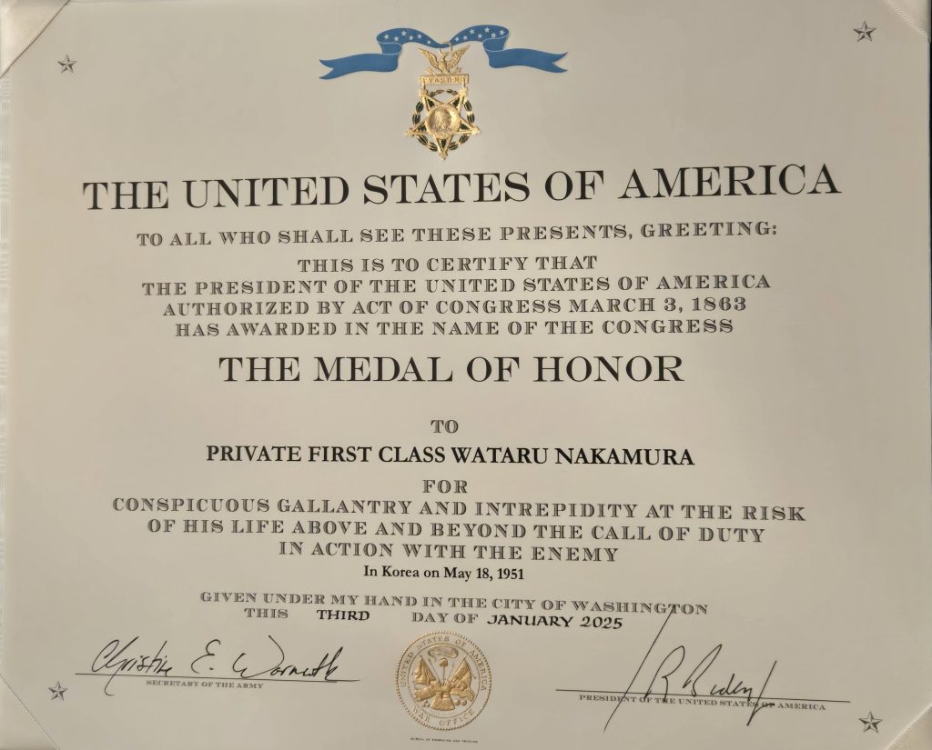 Medal of Honor Certificate signed by President Joseph R. Biden Photo courtesy of Gary Takashima.