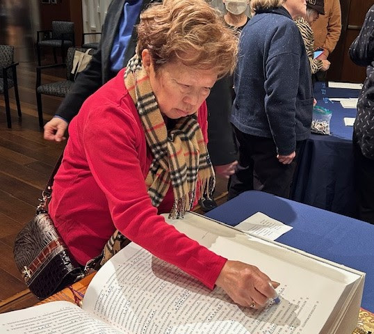 The Ireichō, created by The Irei Project in October 2022, is a book with over 1,000 pages and weighs twenty-five pounds. It contains the names of 125,284 individuals of Japanese ancestry incarcerated during World War II. Over the last two years, the project brought tens of thousands of visitors to the Japanese American National Museum to acknowledge and stamp the names of those unjustly incarcerated as an act of remembrance and repair.